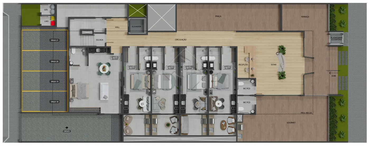 O condomínio conta com área de lazer completa, garantindo momentos de descanso e bem-estar, além de oferecer mais comodidade e valorização ao imóvel.