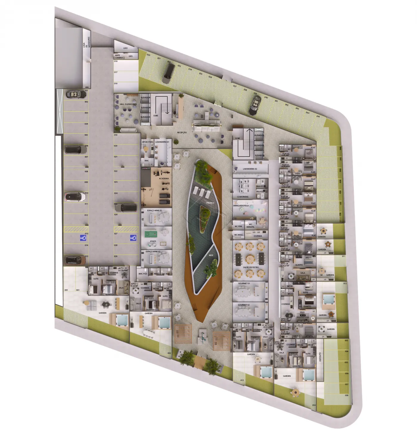 -14 apartamentos com jardins privativos, sendo 07 unidades de 02 quartos e 07 unidades de 01 quarto
