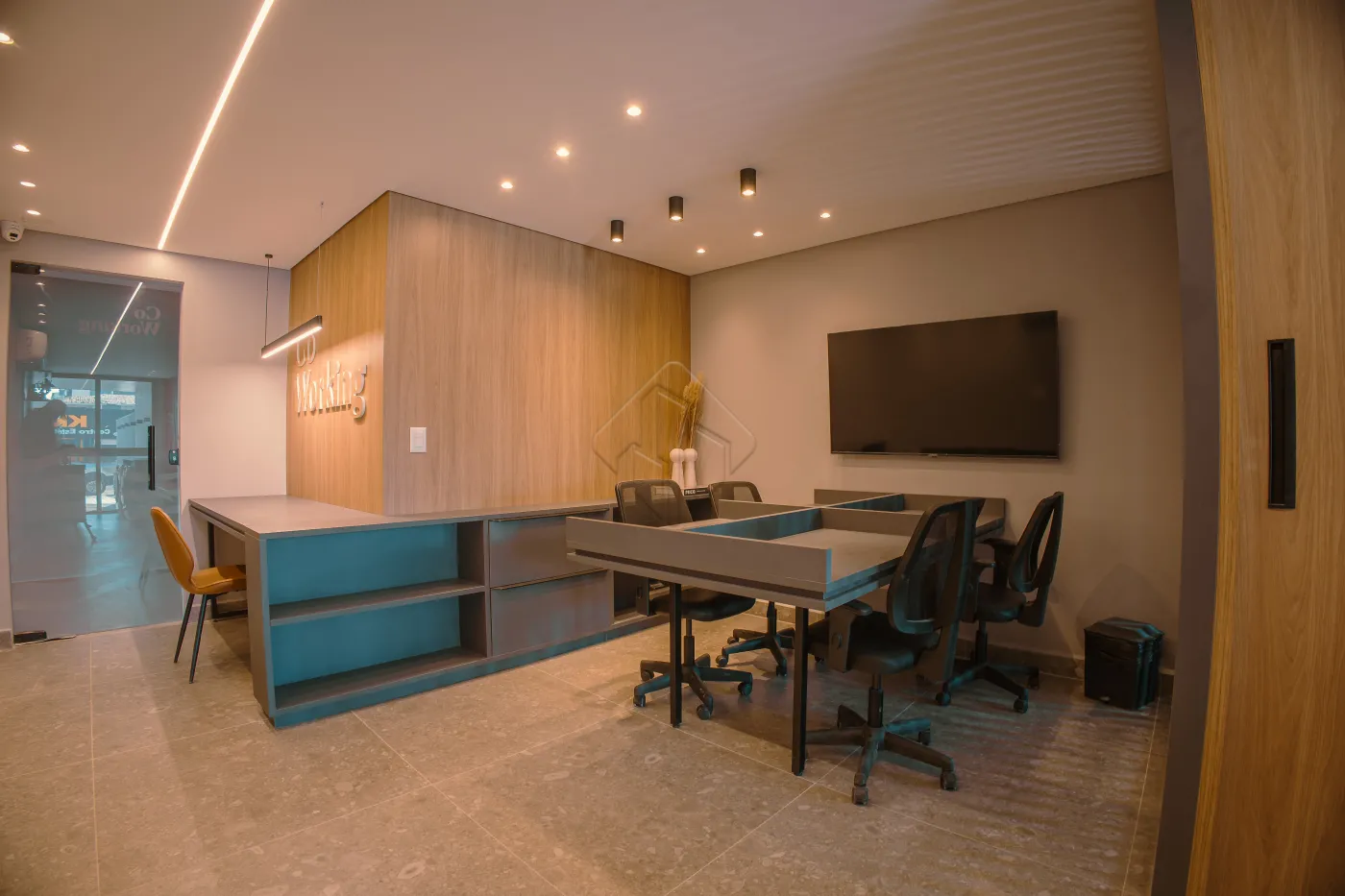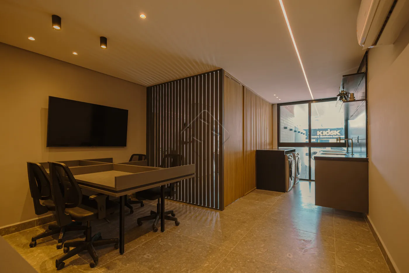 A sala para dois ambientes com varanda gourmet oferece espaço ideal para estar e jantar, com ótimo aproveitamento da área. A cozinha com área de serviço integrada traz praticidade ao dia a dia, mantendo os ambientes organizados e funcionais.