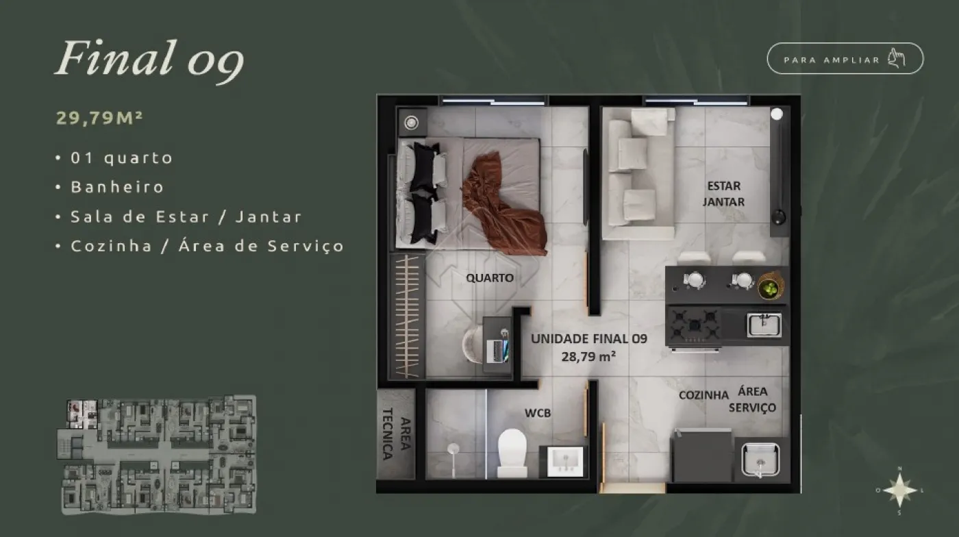 - Plantas que variam entre 29m² a 77m²;