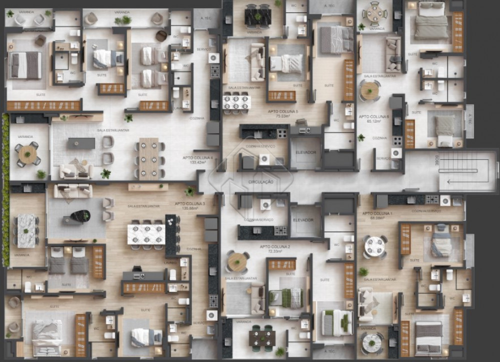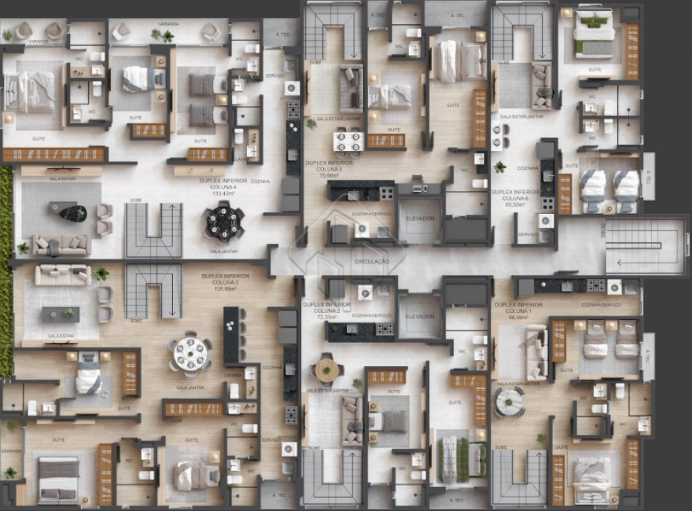 Os apartamentos contam com 2, 3 ou 4 quartos, com 2, 3 ou 4 suites, proporcionando privacidade e comodidade para toda a familia. As unidades oferecem sala para dois ambientes com varanda, integrando estar e jantar de forma harmoniosa, alem de cozinha funcional, area de servico e banheiro social, com plantas inteligentes que valorizam cada espaco.
