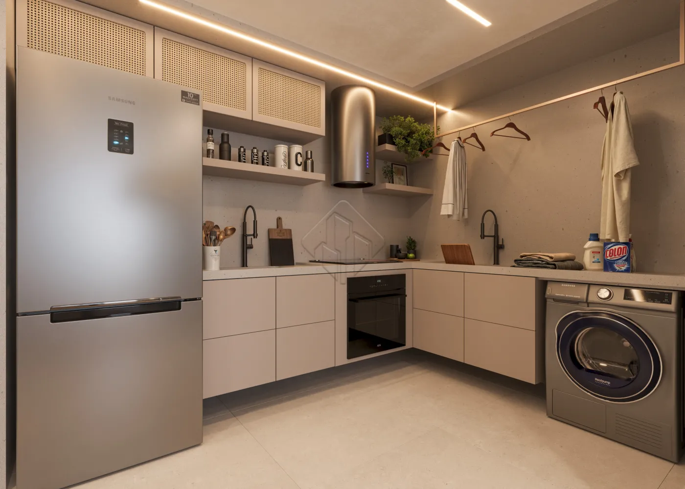 A cozinha possui ótimo espaço e integração prática com a área de serviço, facilitando a rotina do dia a dia. O imóvel conta ainda com banheiro social, garantindo mais comodidade para moradores e visitas.