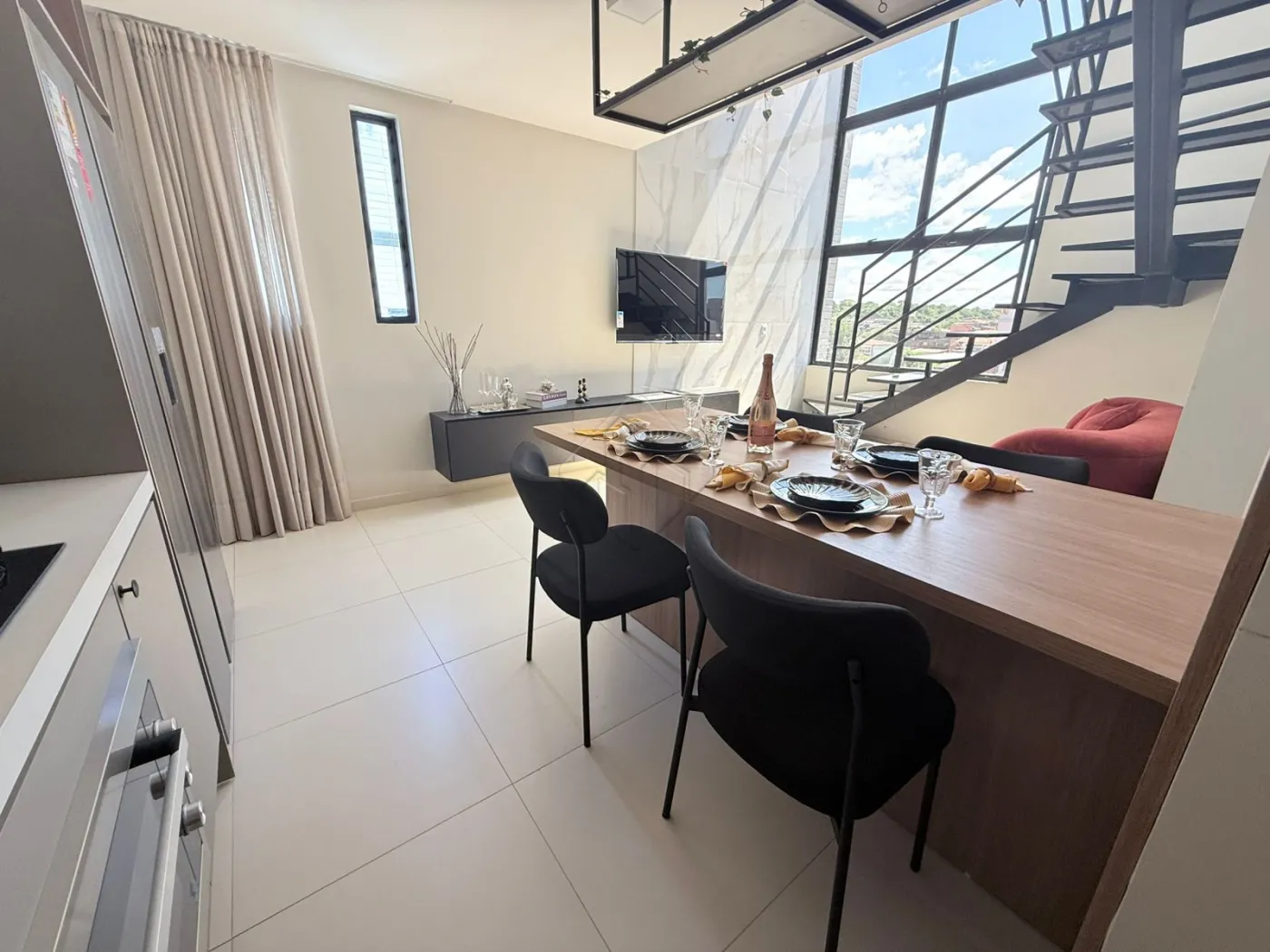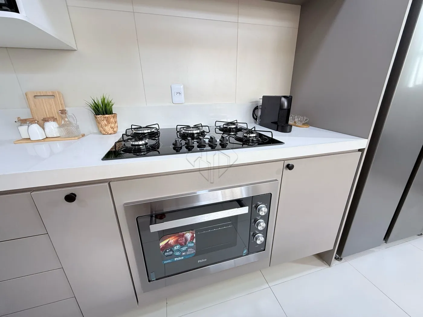 Cozinha completa: bancada em Silestone, fogão 5 bocas, geladeira 434L, forno, micro-ondas, air fryer, sanduicheira e lava e seca