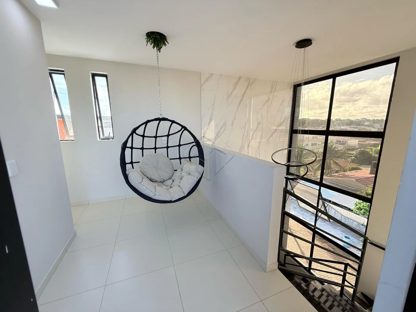 Sala com pé-direito duplo, sofá confortável, cadeirão relaxante, Smart TV 50??
