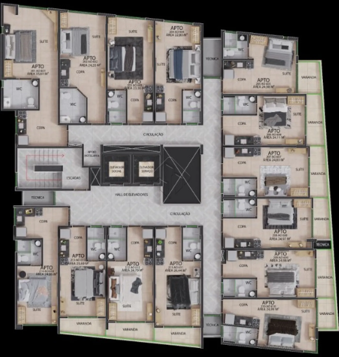 - Plantas que variam entre 24m² a 44m²;