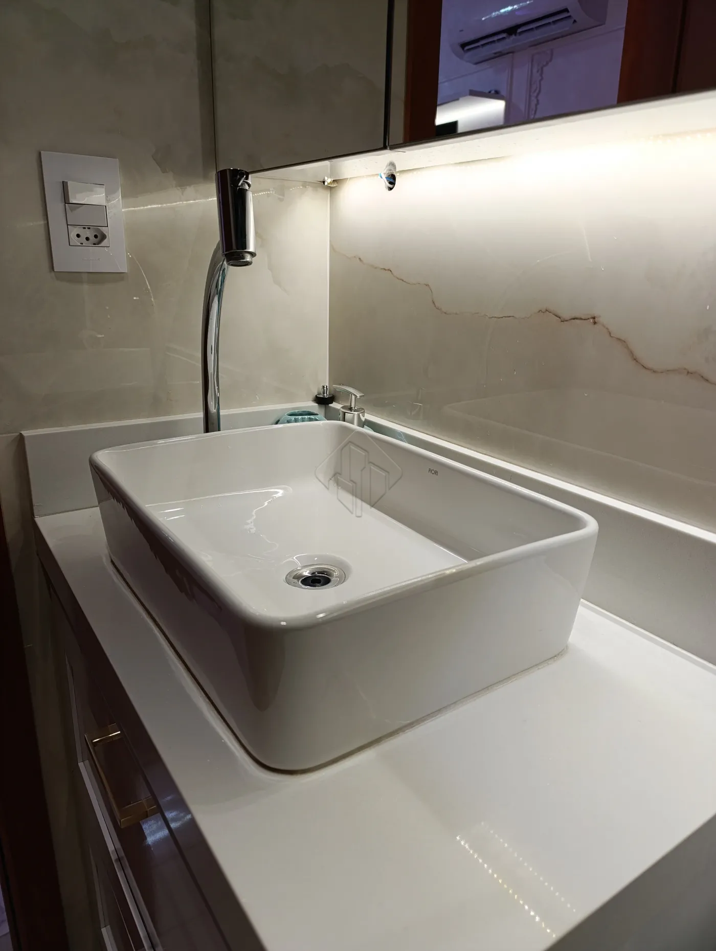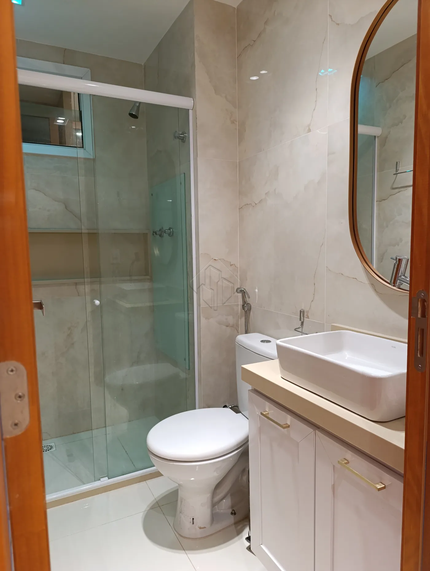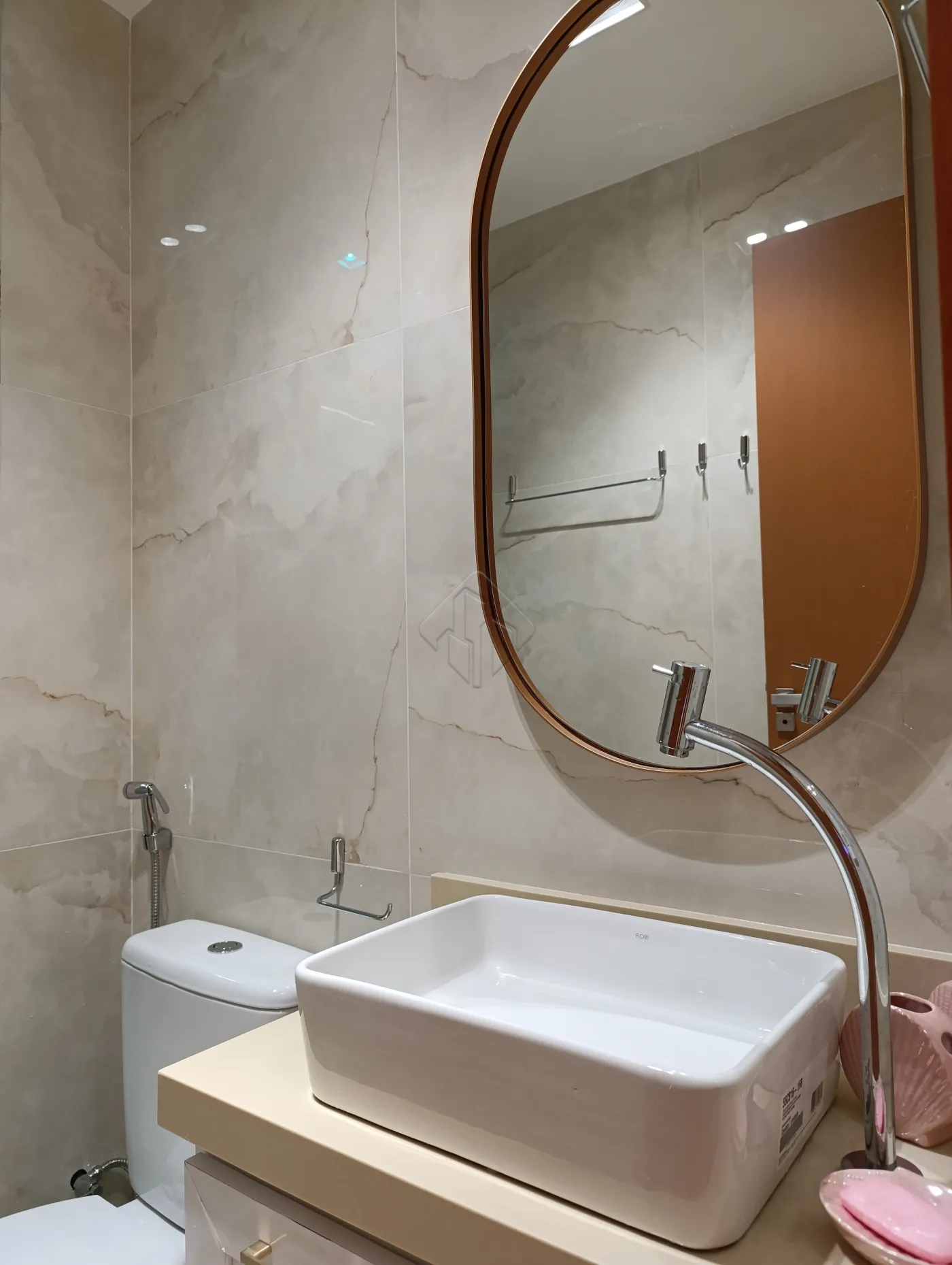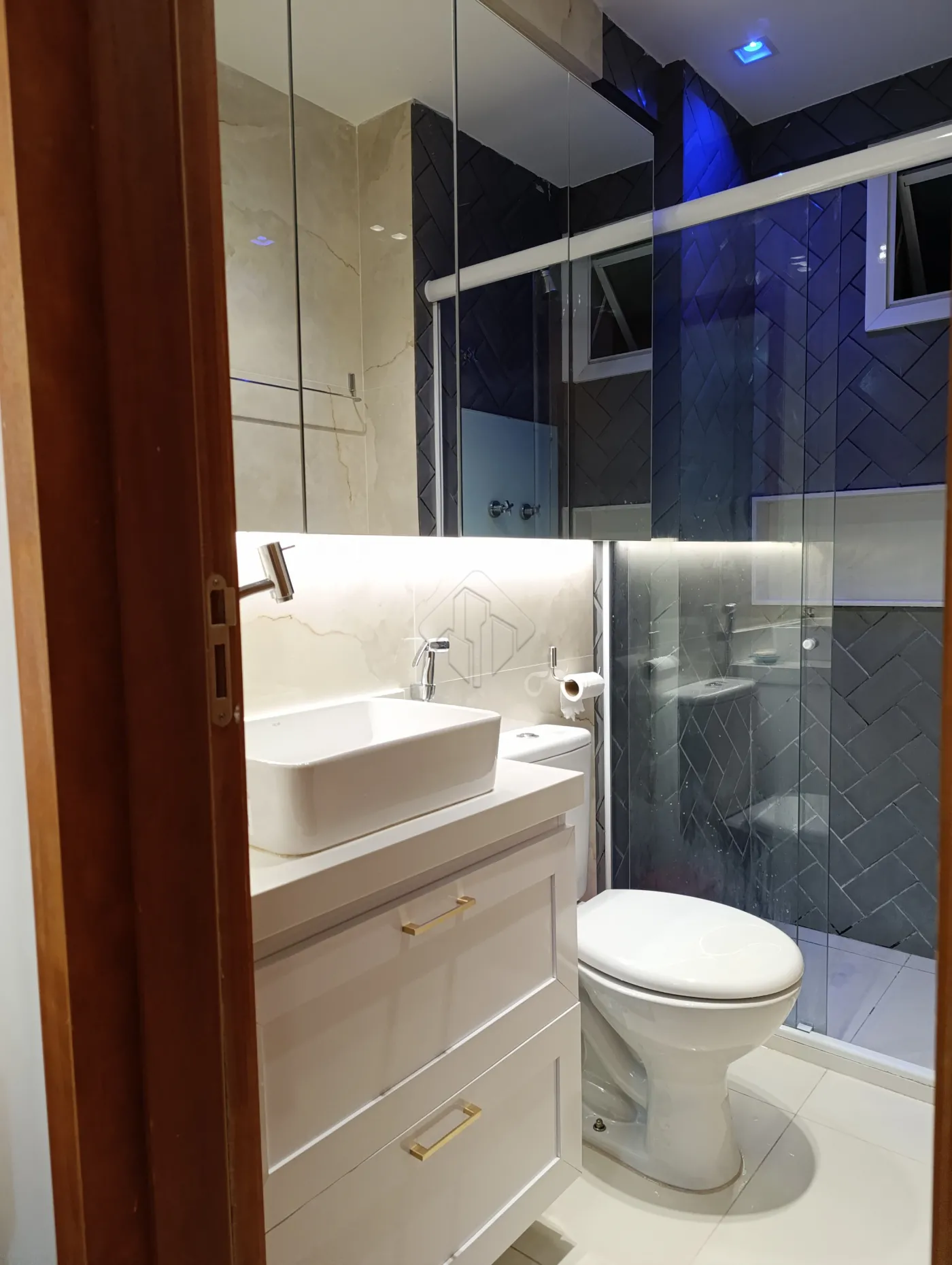 -2 banheiros com acabamento de alto padrão, revestidos em porcelanato, com bancadas e nichos em mármore, cuba de sobrepor e armários projetados.