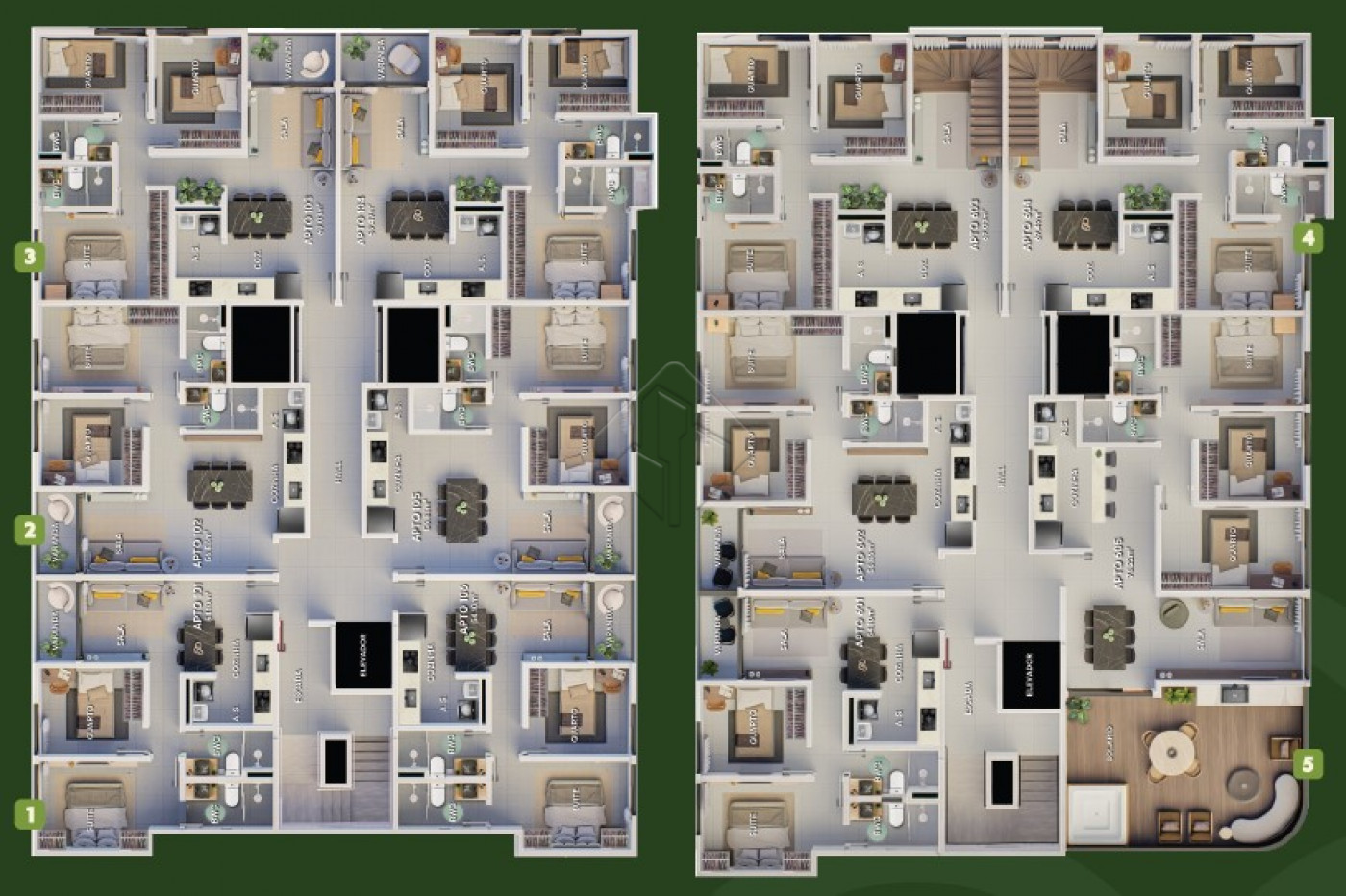 Os apartamentos contam com 2 ou 3 quartos, com 1 suite, proporcionando privacidade e comodidade para toda a familia. As unidades oferecem sala para dois ambientes com varanda, integrando estar e jantar de forma harmoniosa, alem de cozinha funcional, area de servico e banheiro social, com plantas inteligentes que valorizam cada espaco.