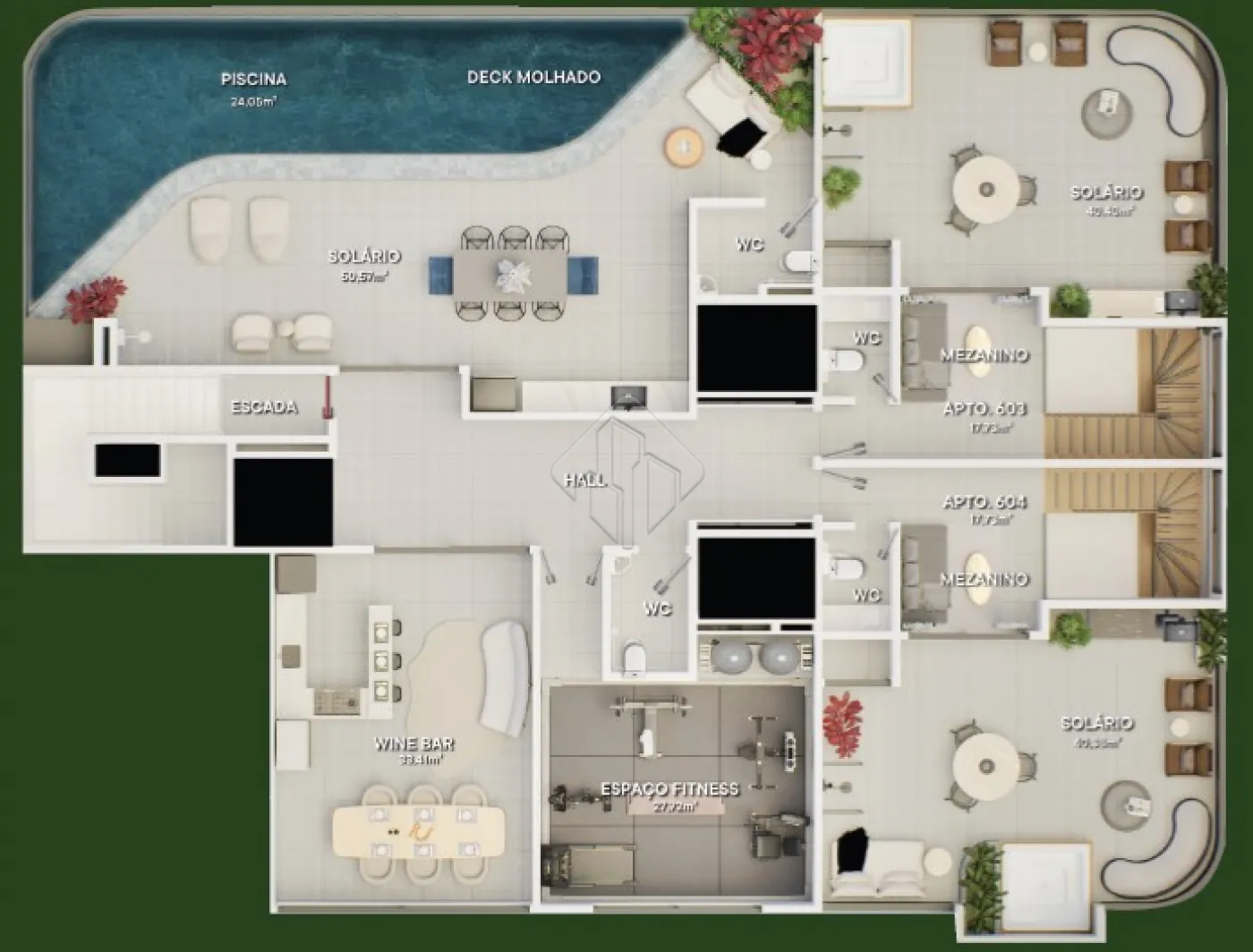 - Com área gourmet externa privativa com hidro;