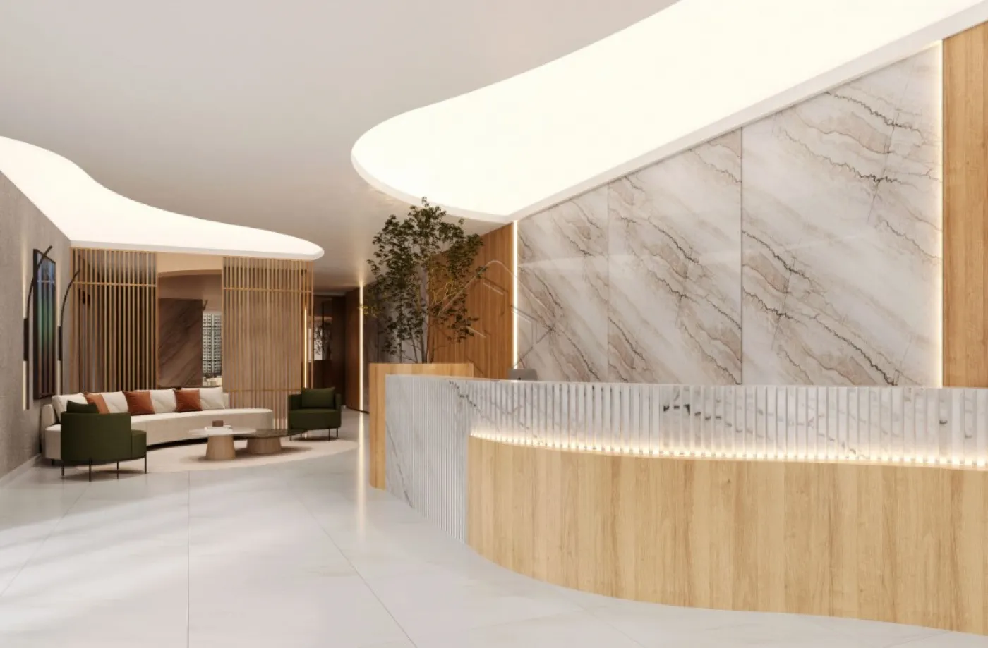 ? Lobby elegante: um espaço sofisticado e acolhedor para recepcionar moradores e visitantes, com design moderno e decoração de alto padrão.