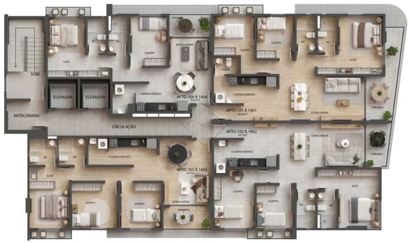 Apartamentos tipo: 64,59m² a 89,80m², com 2 e 3 quartos