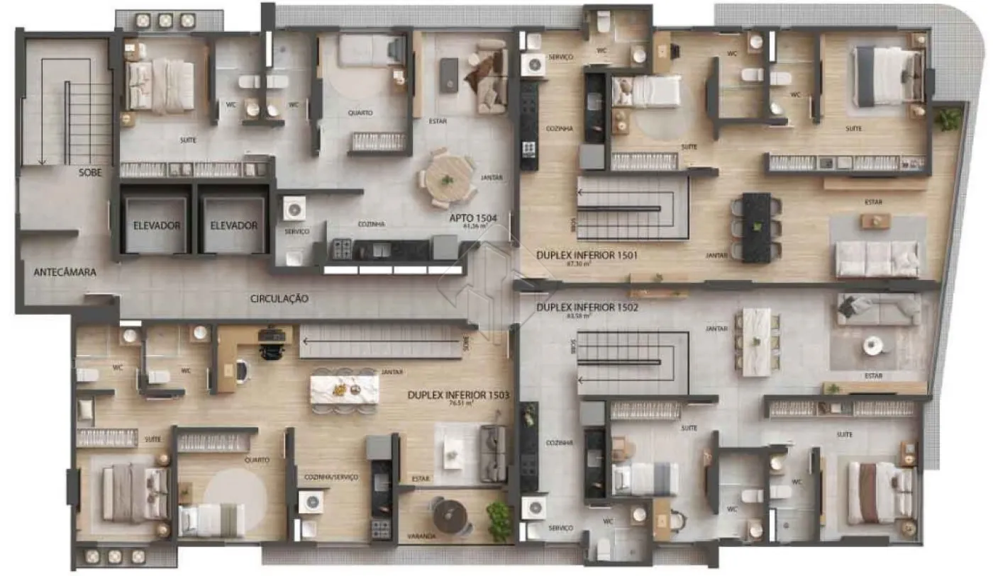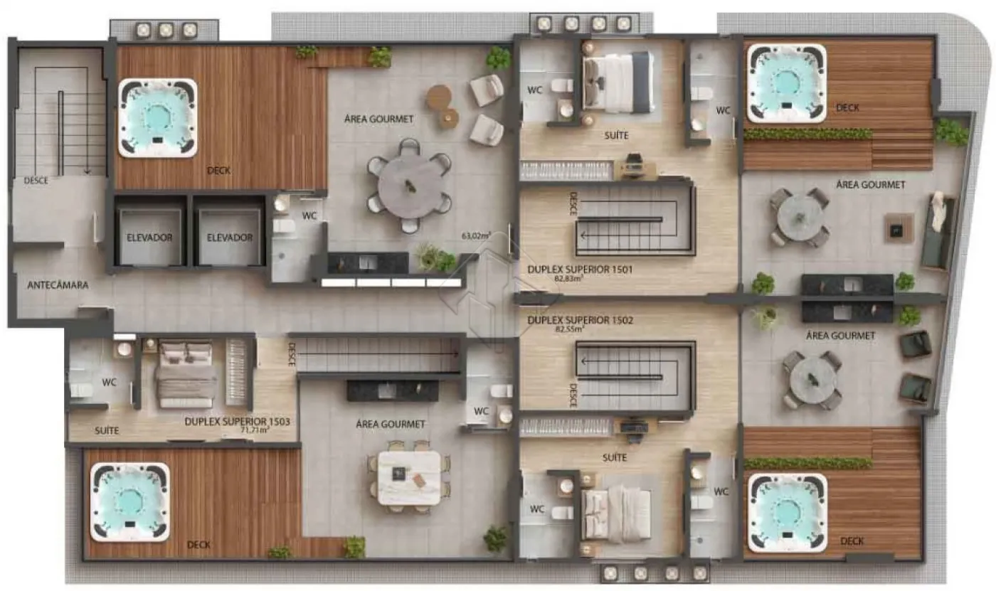 Coberturas Duplex: 128,18m² a 175,91m², com 2 e 3 quartos